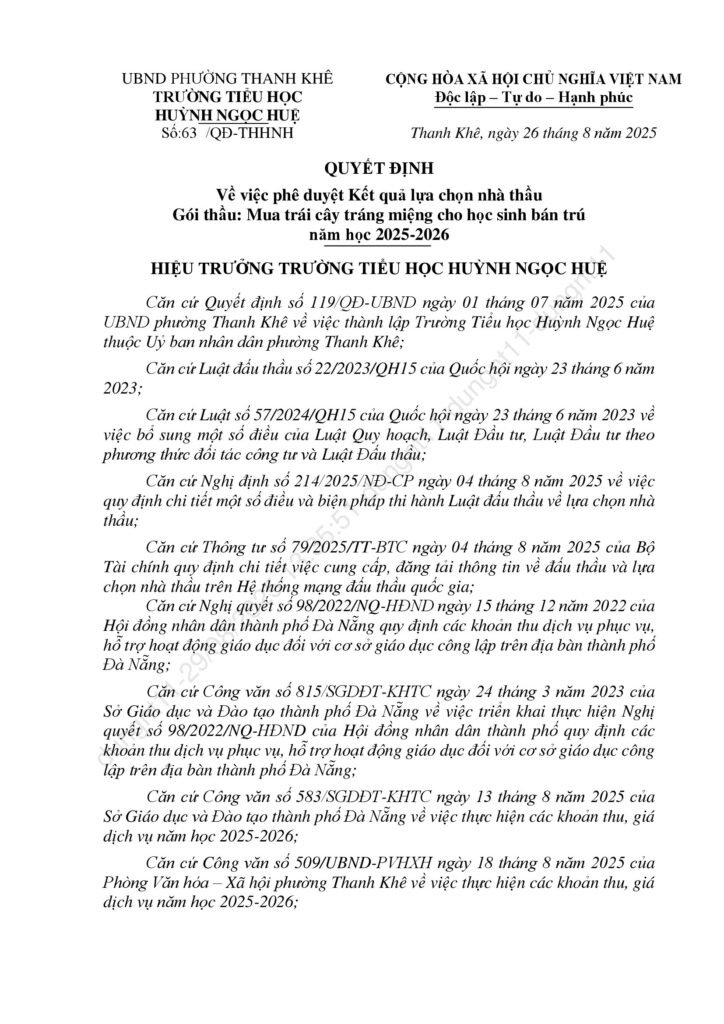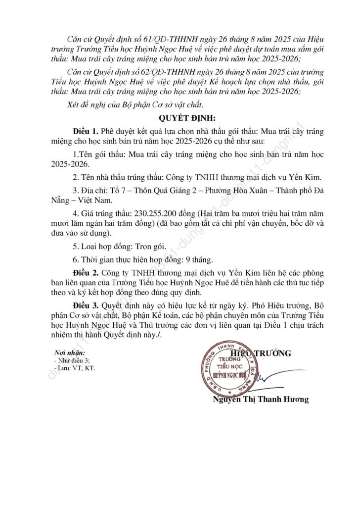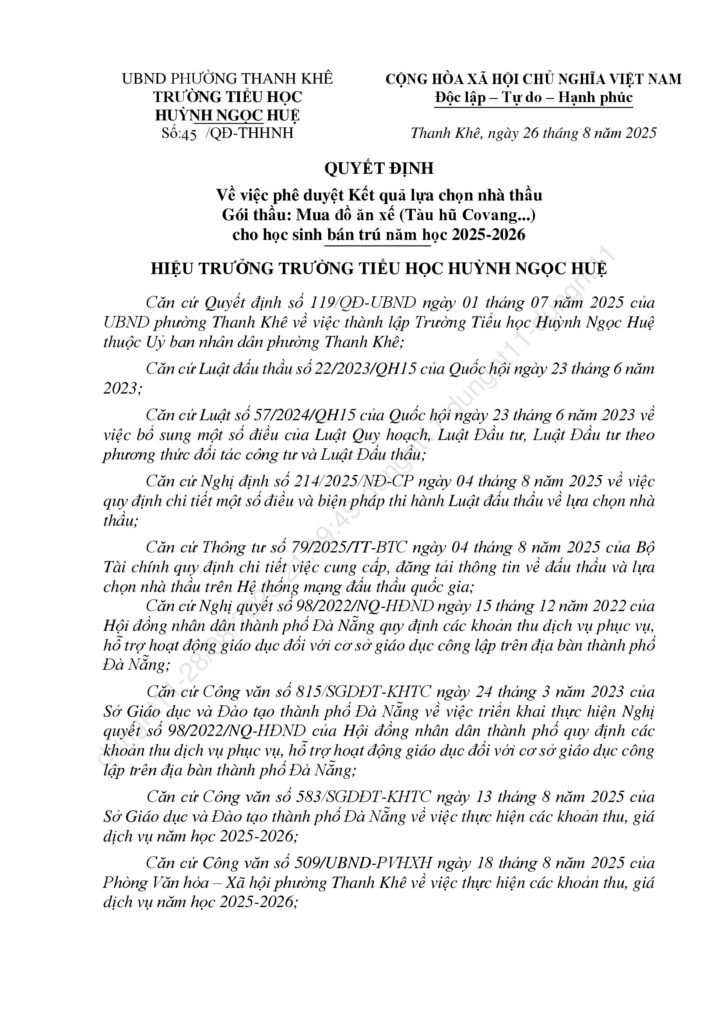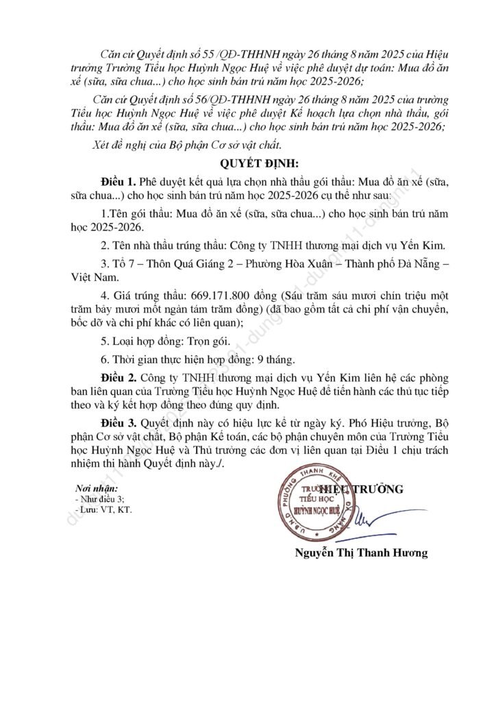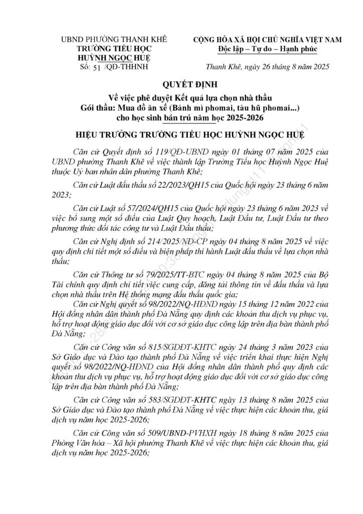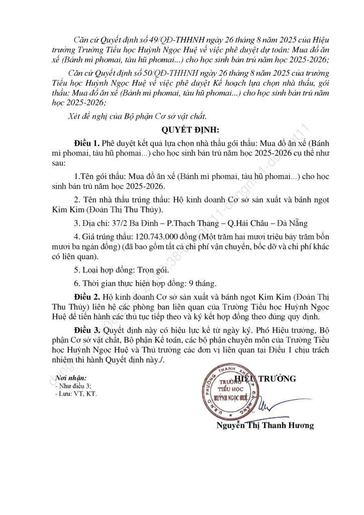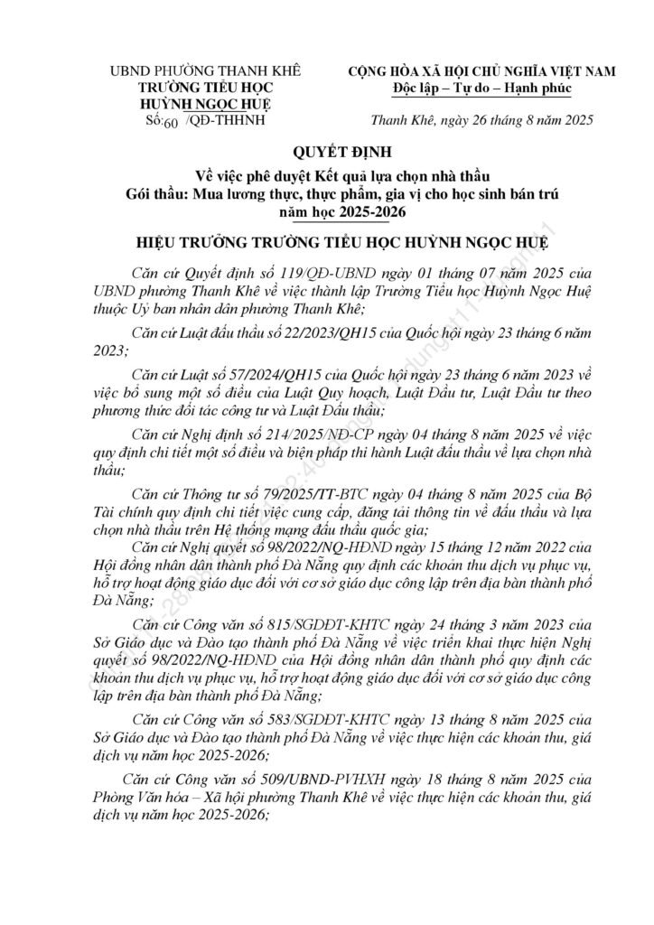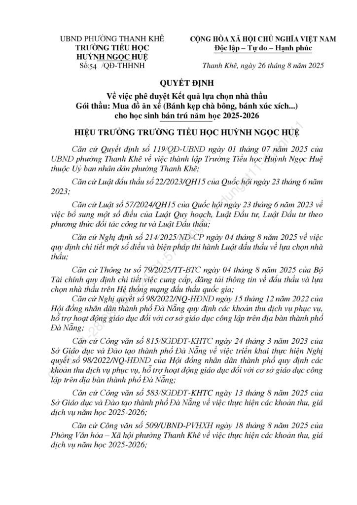 Thông báo kết quả trúng thầu các gọi thầu liên quan đến cung ứng sản phẩm phục vụ cho hoạt động bán trú năm học 2025-2026
