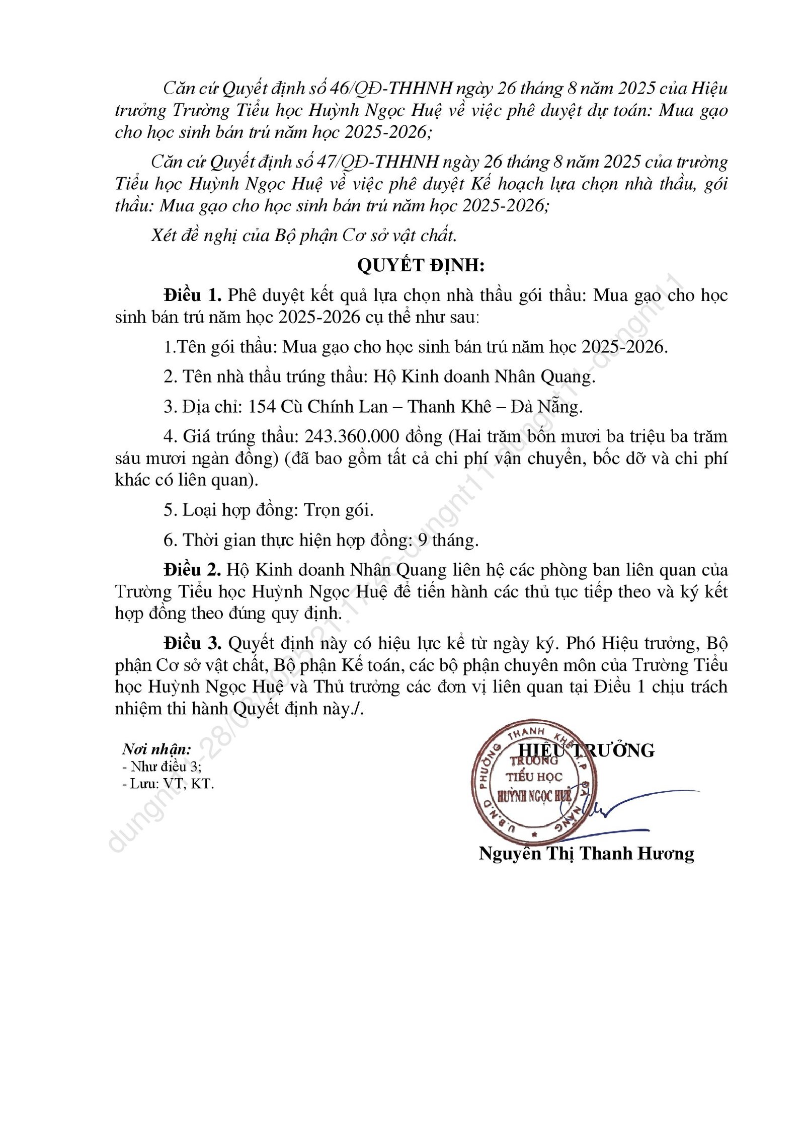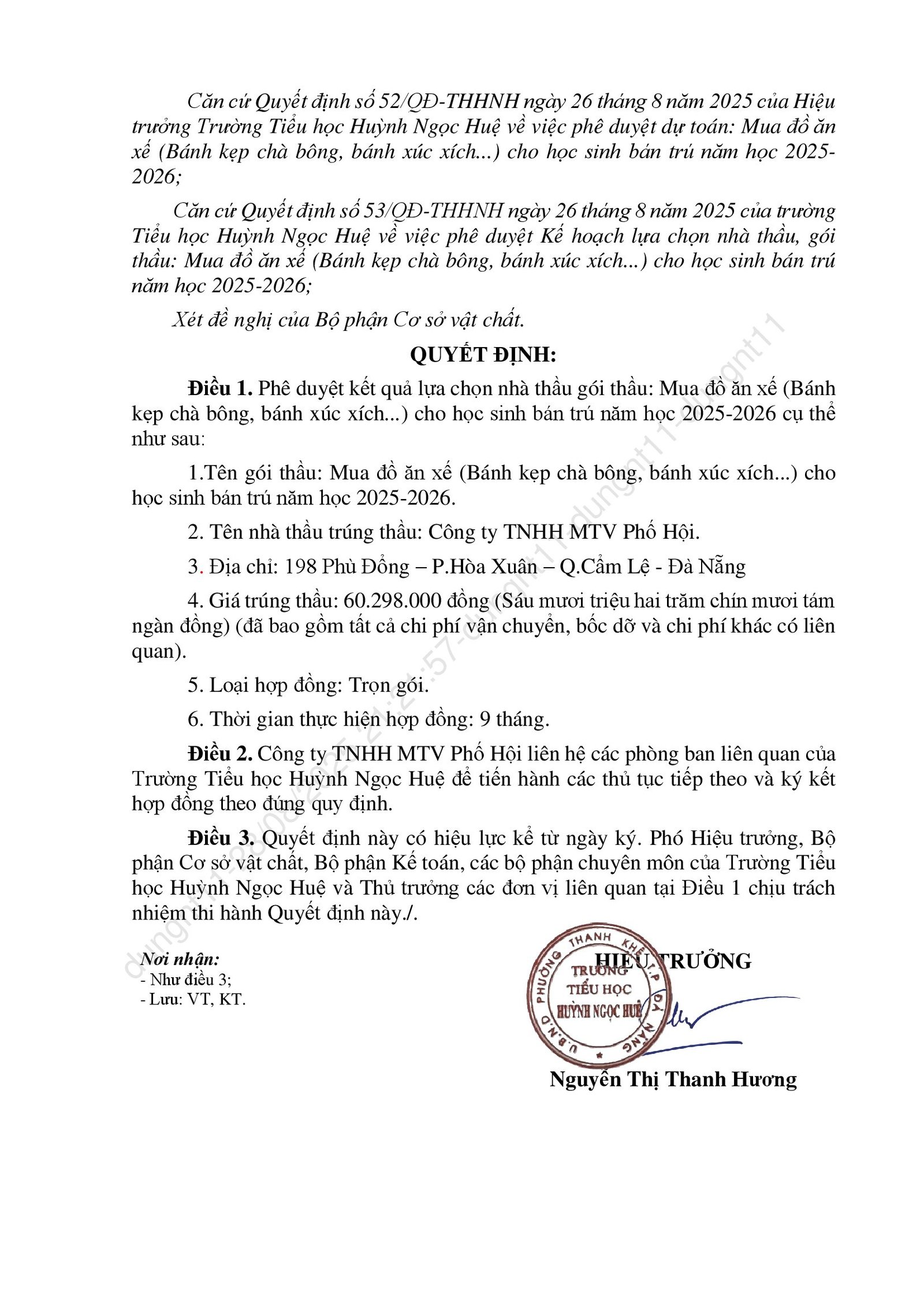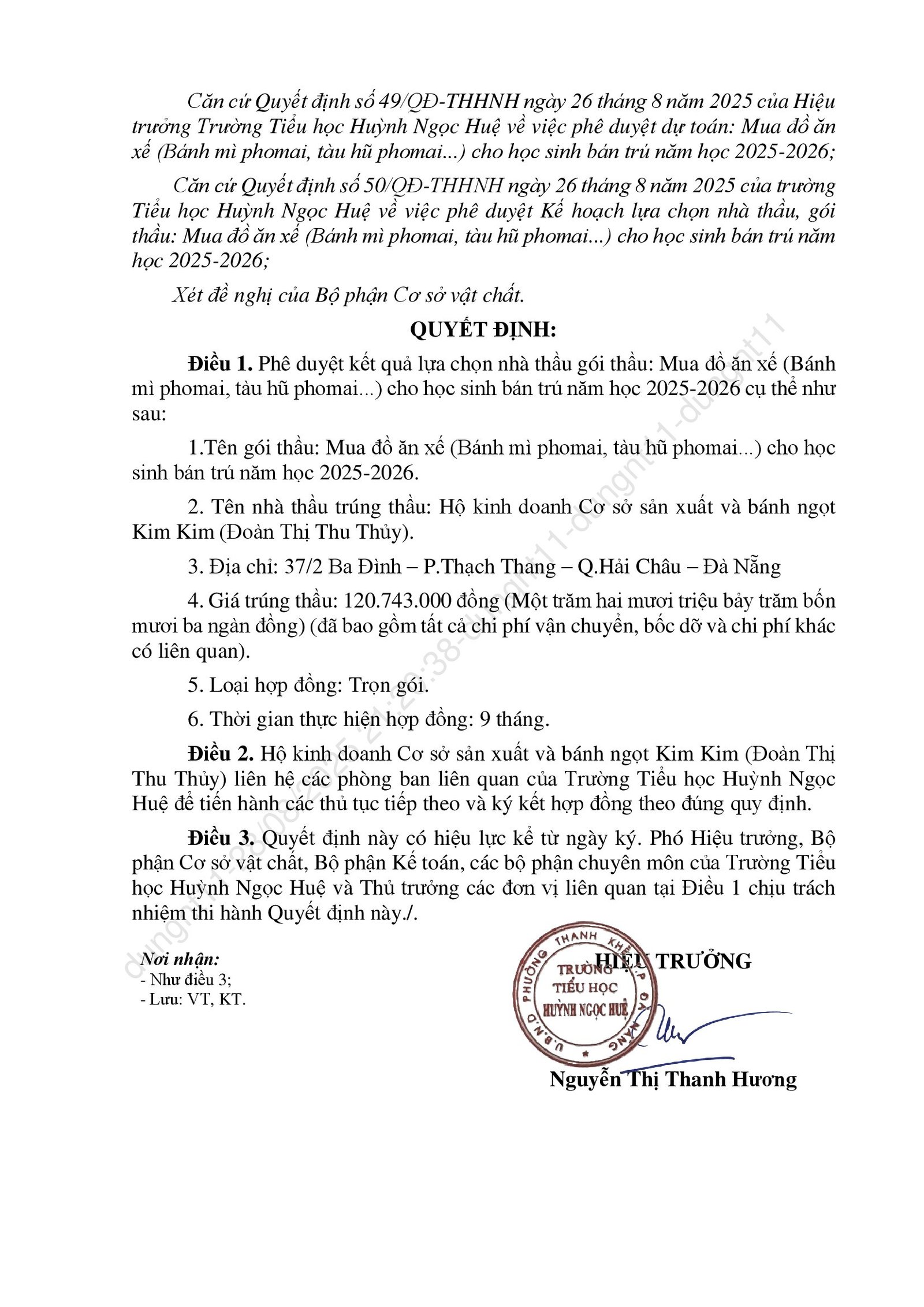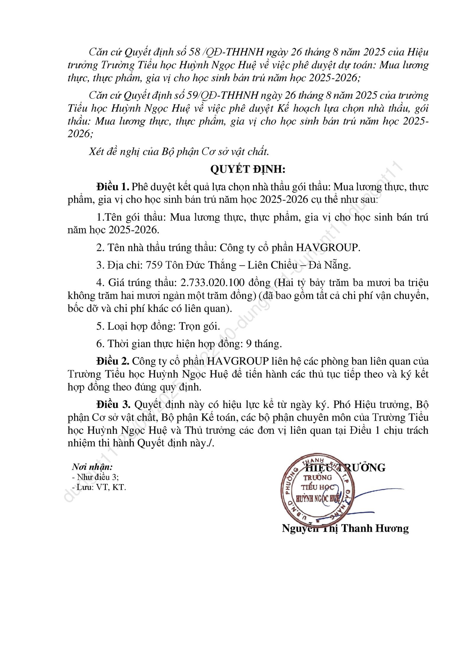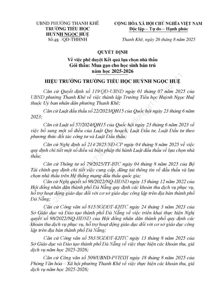 Thông báo kết quả trúng thầu các gọi thầu liên quan đến cung ứng sản phẩm phục vụ cho hoạt động bán trú năm học 2025-2026
