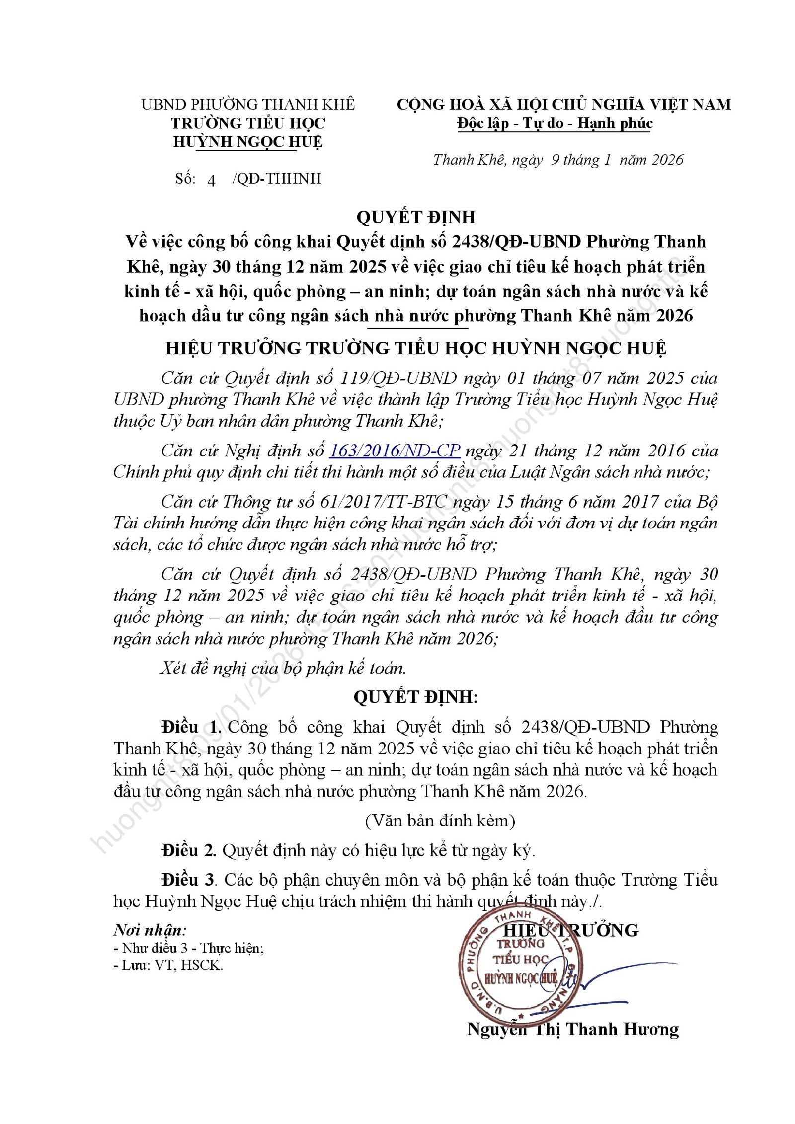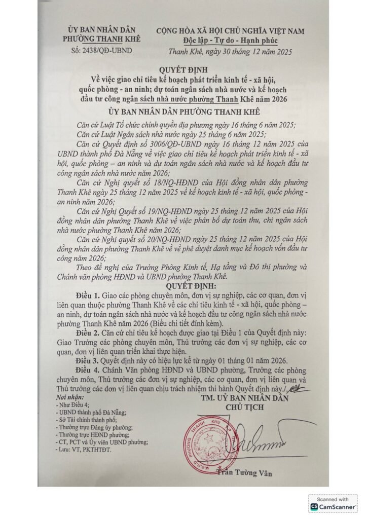 VỀ VIỆC CÔNG BỐ CÔNG KHAI QUYẾT ĐỊNH SỐ 2438/QĐ-UBND PHƯỜNG THANH KHÊ, NGÀY 30 THÁNG 12 NĂM 2025 VỀ VIỆC GIAO CHỈ TIÊU KẾ HOẠCH PHÁT TRIỂN KINH TẾ- XÃ HỘI, QUỐC PHÒNG – AN NINH; DỰ TOÁN NGÂN SÁCH NHÀ NƯỚC VÀ KẾ HOẠCH ĐẦU TƯ CÔNG NGÂN SÁCH NHÀ NƯỚC PHƯỜNG THANH KHÊ NĂM 2026