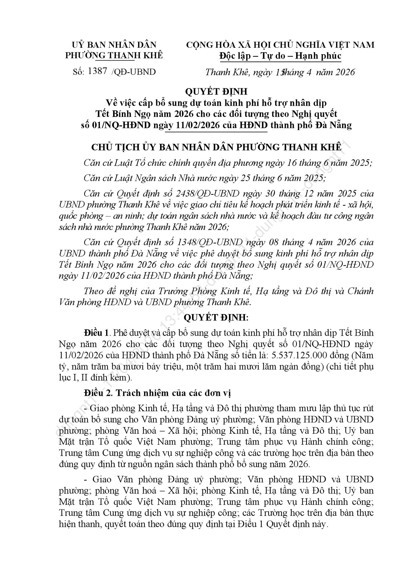 V/V CẤP BỔ SUNG DỰ TOÁN KINH PHÍ HỖ TRỢ NHÂN DỊP