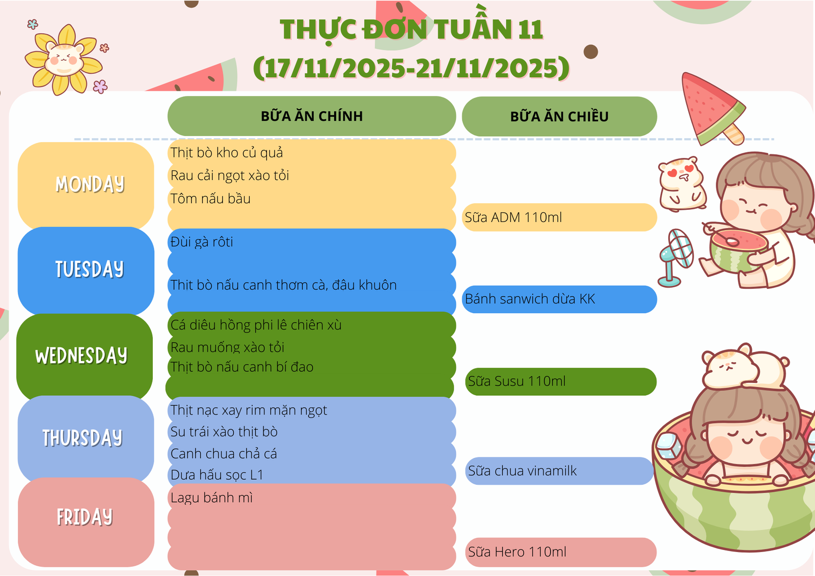 THỰC ĐƠN TUẦN 11 (17/11/2025 – 21/11/2025)