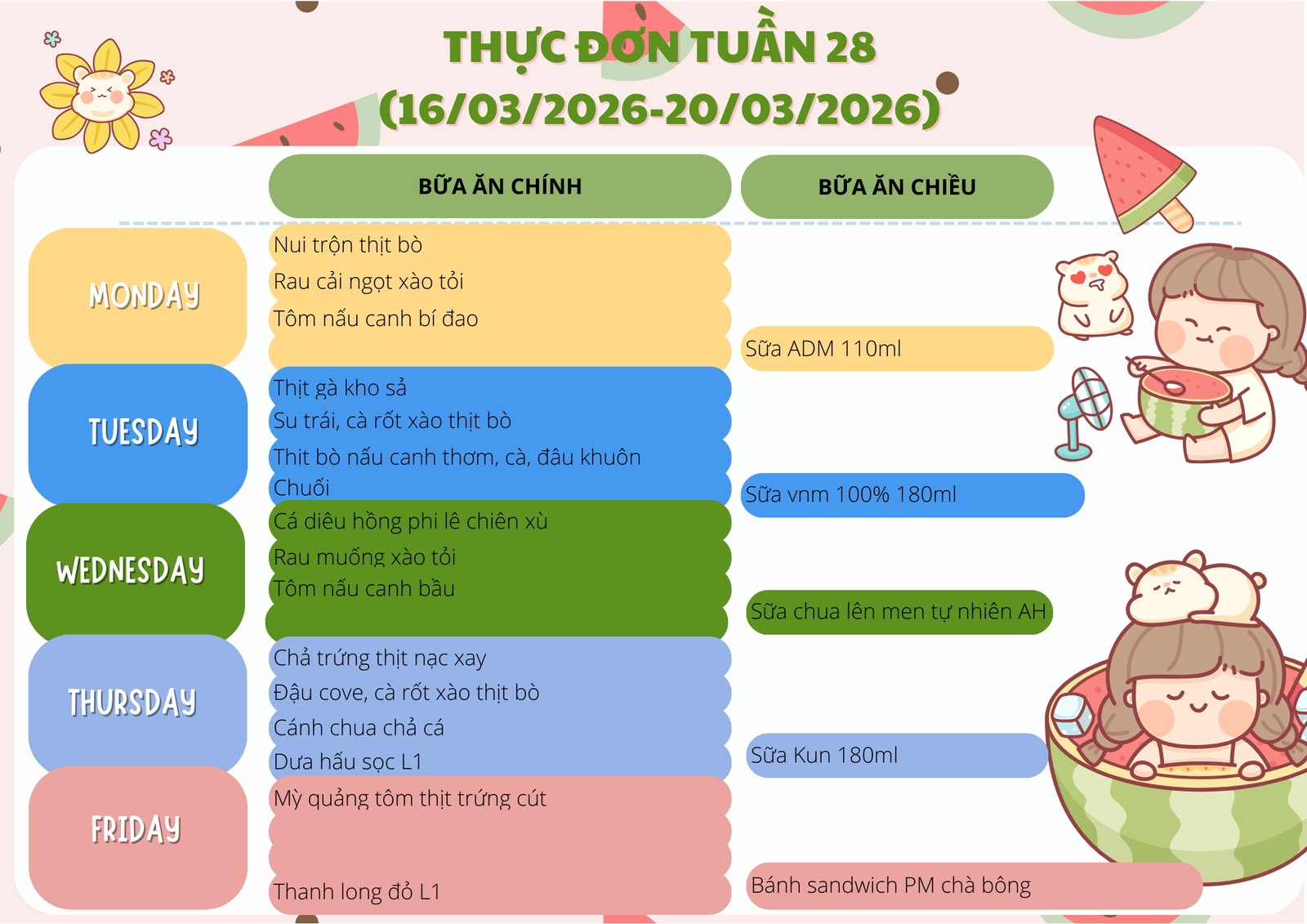 THỰC ĐƠN TUẦN 28 (16/03/2026 – 20/03/2026)