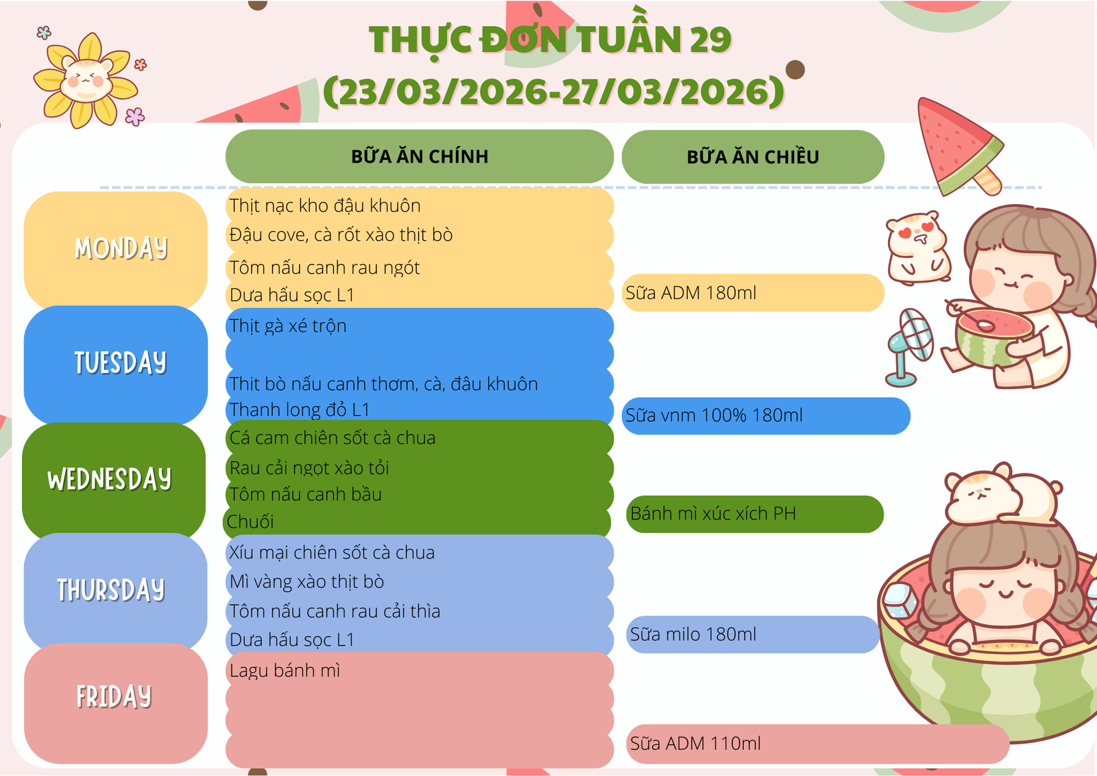 THỰC ĐƠN TUẦN 29 (23/03/2026 – 27/03/2026)