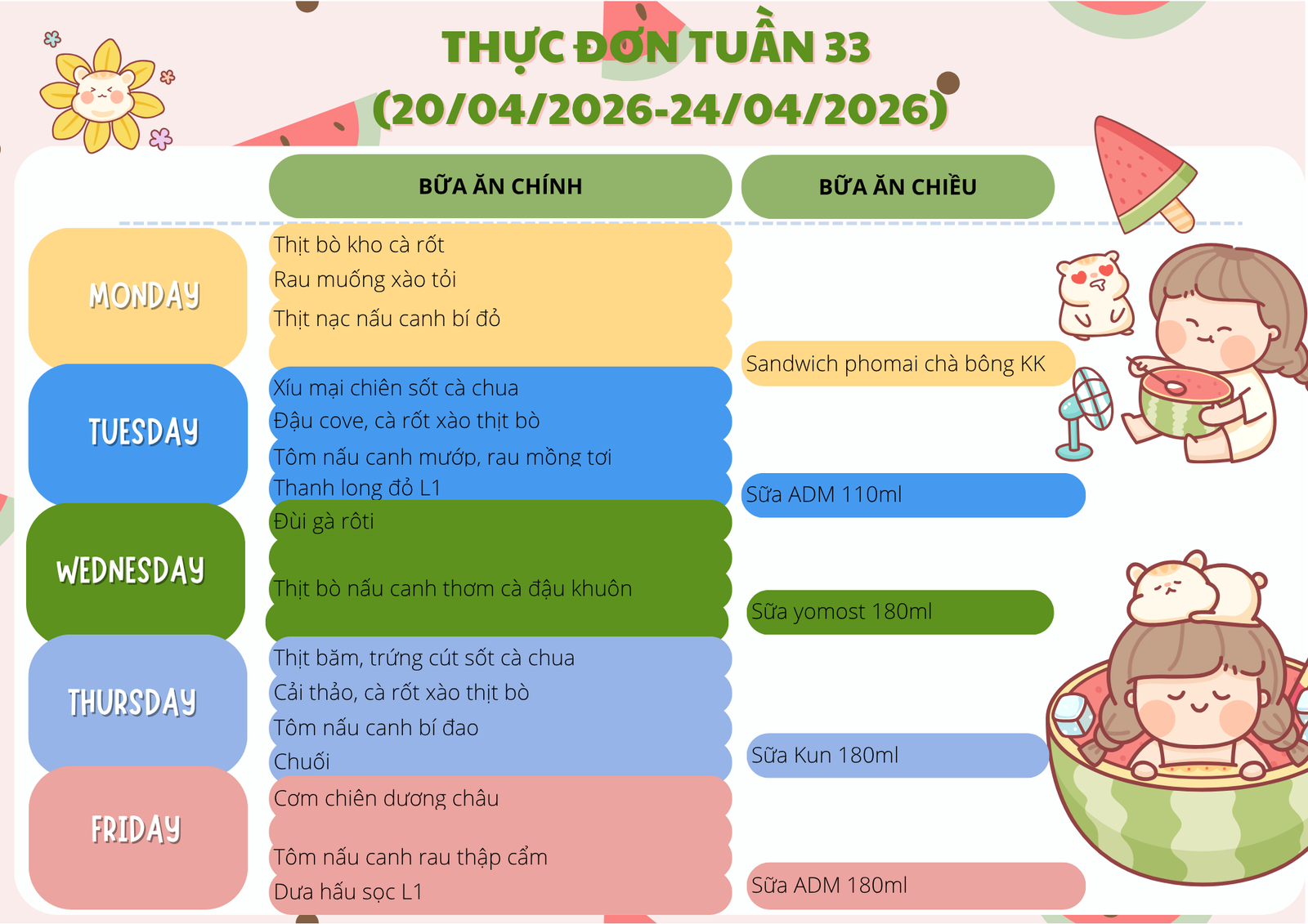 THỰC ĐƠN TUẦN 33 (20/04/2026 – 24/04/2026)