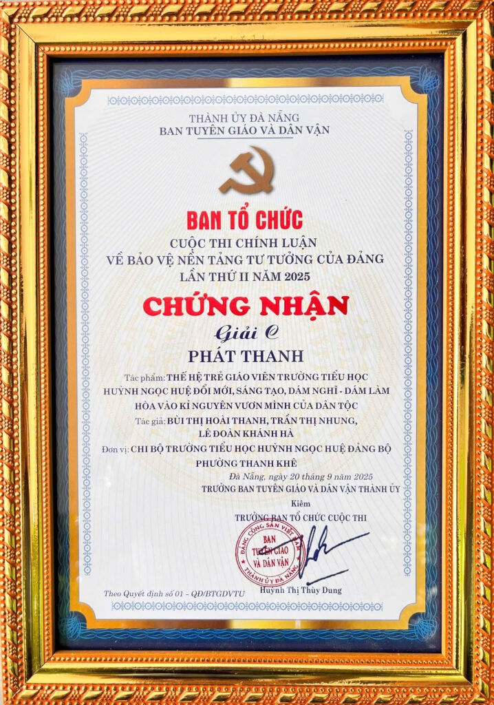 Chi bộ trường TH Huỳnh Ngọc Huệ và Nhà trường xin chúc mừng 3 Cô giáo: Bùi Thị Hoài Thanh, Trần Thị Nhưng, Lê Đoàn Khánh Hà đã đạt giải C – thể loại phát thanh tại Cuộc thi chính luận về bảo vệ nền tảng tư tưởng của Đảng lần thứ II năm 2025. Với tác phẩm: “Thế hệ trẻ giáo viên Trường TH Huỳnh Ngọc Huệ đổi mới sáng tạo- Dám nghĩ, dám làm hòa vào kỷ nguyên của dân tộc”