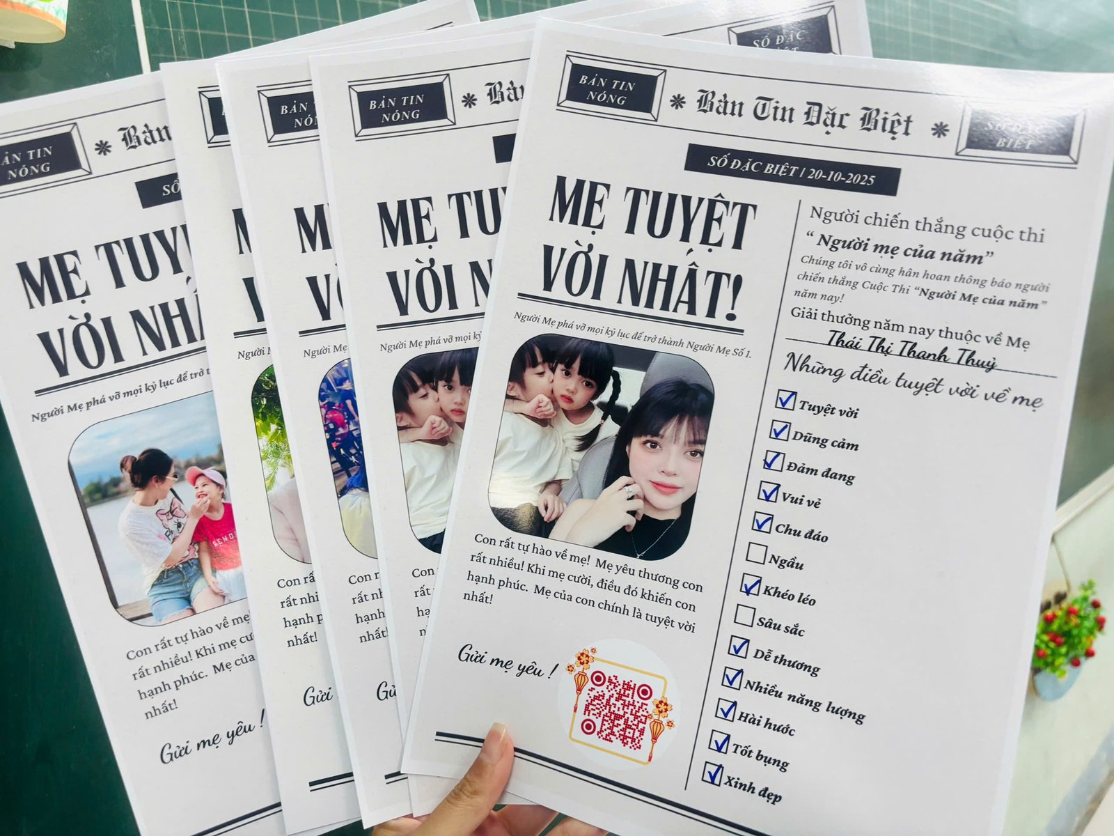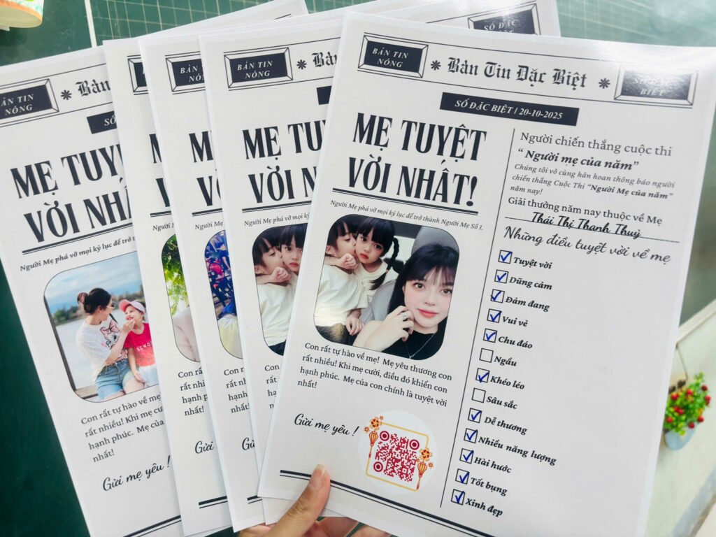 Chào mừng Ngày Phụ nữ Việt Nam 20/10, cô giáo Ngọc Ánh cùng các học sinh lớp 1/5 đã tổ chức một chuỗi hoạt động đầy ý nghĩa, gửi gắm tình yêu thương và lòng biết ơn sâu sắc đến những người mẹ. Mở đầu là hoạt động “Những Điều Tuyệt Vời Về Mẹ”, nơi các em tự tay tick chọn những phẩm chất và hành động tuyệt vời mà các em cảm nhận được từ mẹ mình. Tiếp theo, các con tham gia bốc thăm “Voucher gắn kết yêu thương” tặng mẹ, với cam kết thực hiện những việc nhà ý nghĩa như rửa chén, bóp lưng, trông em hay hát cho mẹ nghe. Đặc biệt, các bố sẽ đóng vai trò quan trọng trong việc hỗ trợ con thực hiện và ghi lại hình ảnh những khoảnh khắc đáng yêu này. Tiếp đến là màn múa tập thể bài hát “Nếp Nhà” như một món quà âm nhạc tri ân. Cuối cùng, để tạo bất ngờ, lời chúc 20/10 của từng học sinh đã được quay thành video, chuyển đổi thành mã QR, và các mẹ chỉ cần quét mã Zalo là có thể đón nhận món quà tinh thần ngọt ngào, ấm áp từ chính con yêu của mình.
