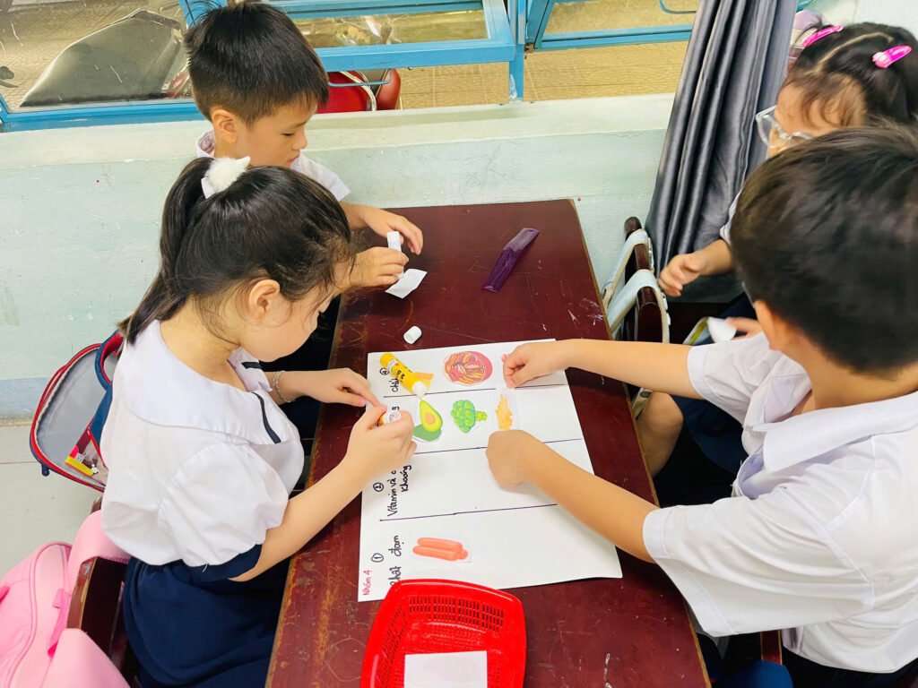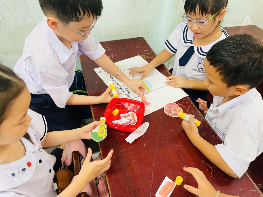 🌿 Các nhóm học sinh hào hứng cùng nhau lựa chọn và phân loại các món ăn thuộc 4 nhóm chất để tạo nên “mâm cơm an toàn”. Từng ánh mắt chăm chú, từng bàn tay cẩn thận dán tranh, tất cả thể hiện tinh thần hợp tác, sáng tạo và ý thức giữ gìn vệ sinh trong ăn uống. Cuối tiết học, các em được củng cố lại nội dung đã học qua trò chơi “Rung chuông vàng”. Một bạn học sinh trong lớp sẽ lên điều khiển trò chơi, cả lớp trả lời các câu hỏi bằng khẩu hình tay. Từ đó, cũng góp phần phát triển năng lực tự học, tự chủ của học sinh.